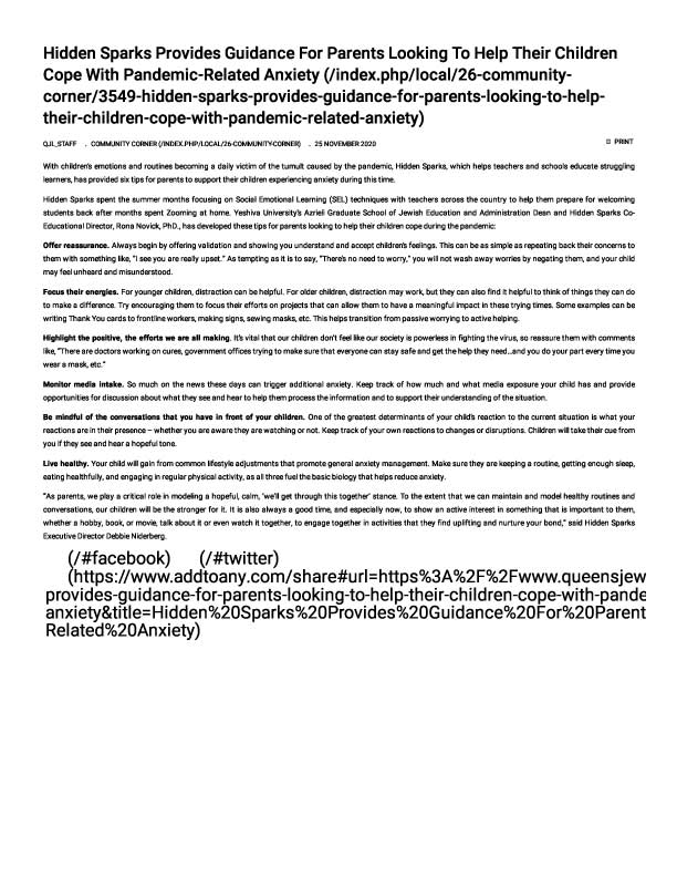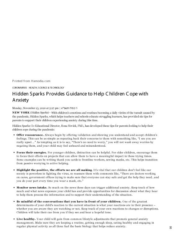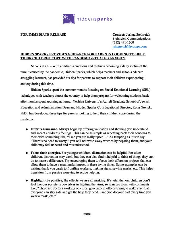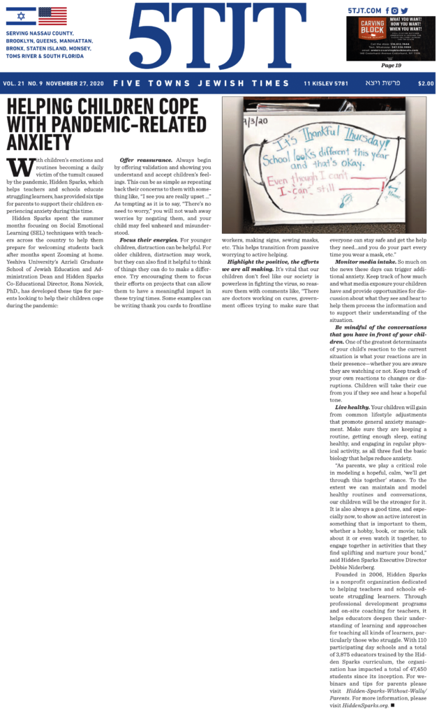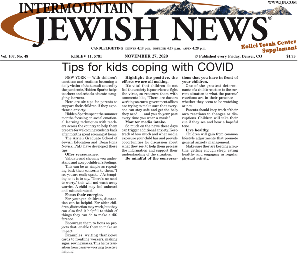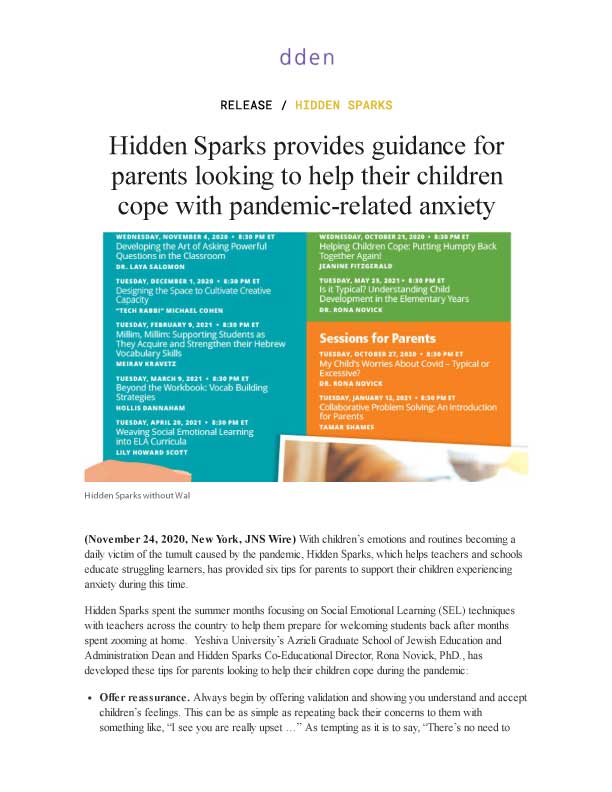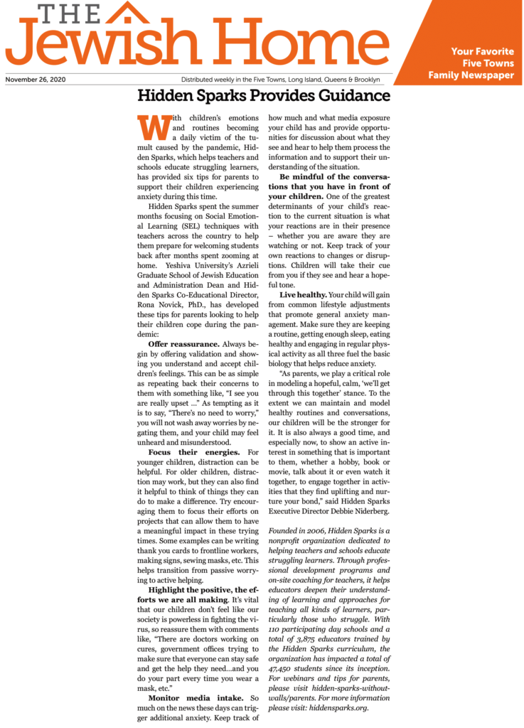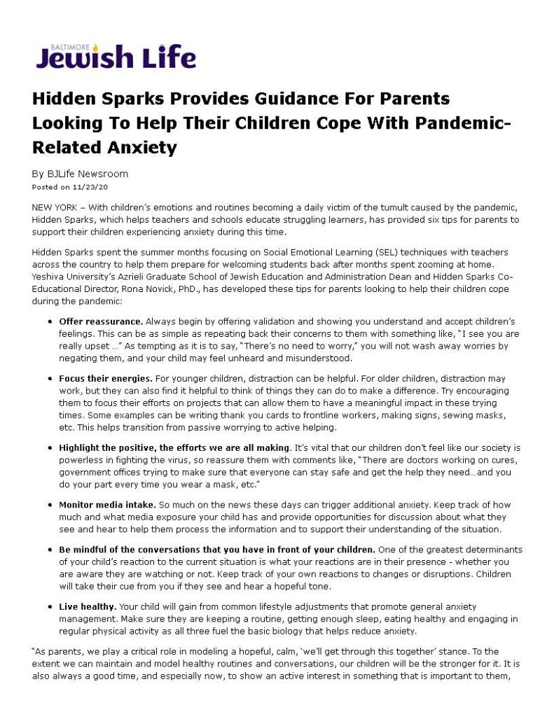 Dr. Rona Novick, Co-Educational Director of Hidden Sparks and Dean of the Azrieli Graduate School at Yeshiva University, offers some guidance for parents on helping their children manage their worries. Click on the image to view the full article. [prkwp_spacer] Previous Next