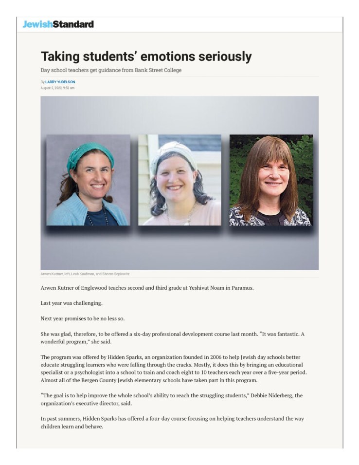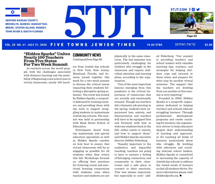 Hidden Sparks’ virtual summer summit held in July 2020 garnered broad press coverage from New York to Baltimore to Florida to Arizona. Covering newspapers included: Baltimore Jewish Life, Five Towns Jewish Times, Jewish Link NJ, Jewish News of Greater Phoenix, Jewish Standard of NJ, Long Island Herald and the South Florida Sun Sentinel, as well as news syndicates such as JNS and online new sites msn.com and yahoo.com.